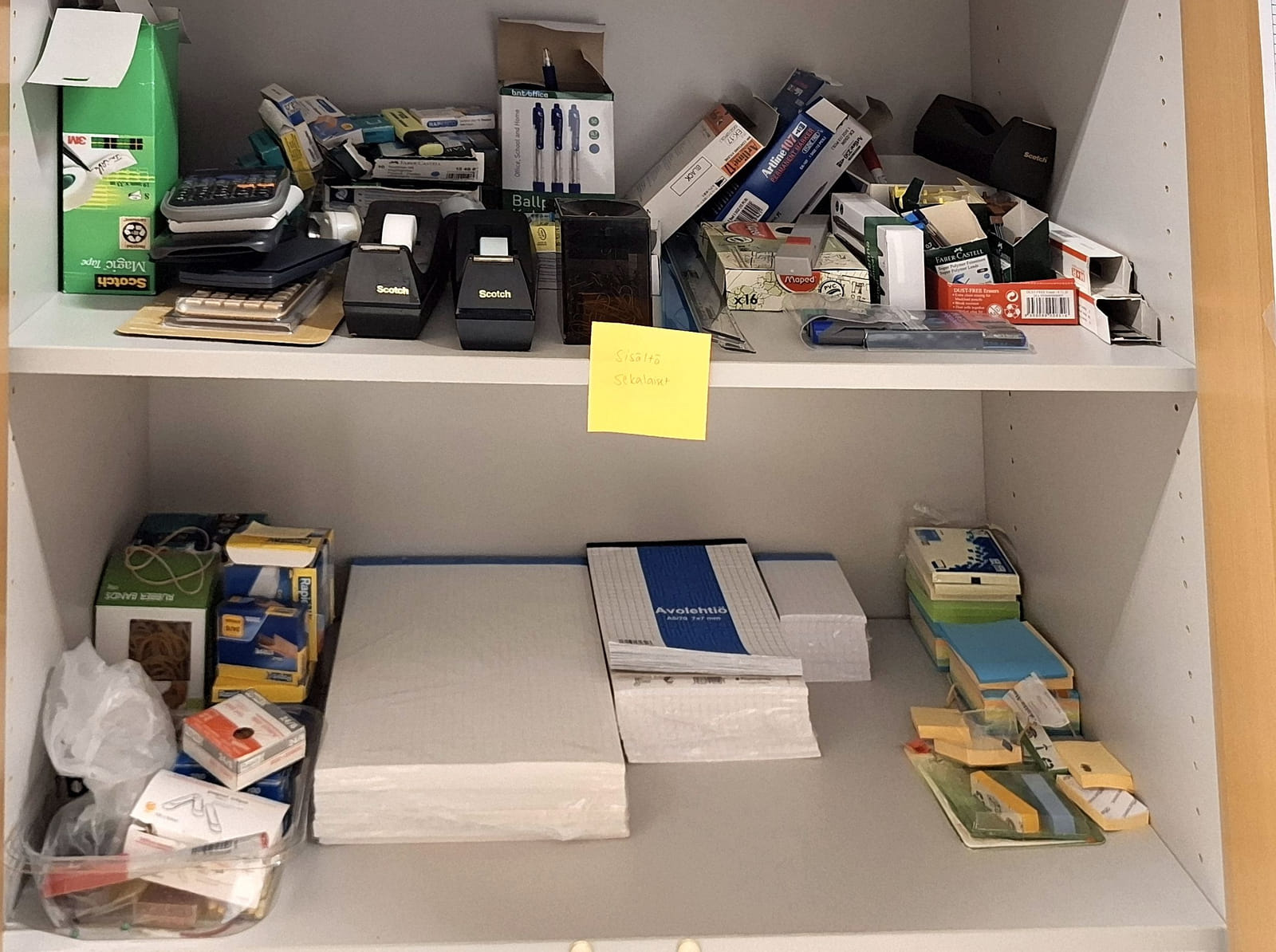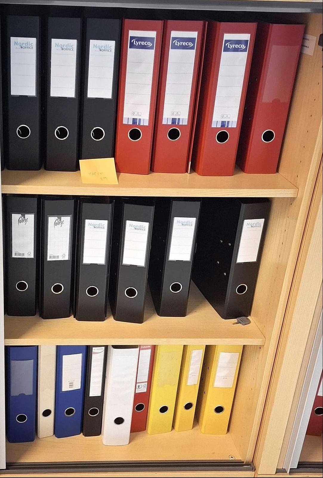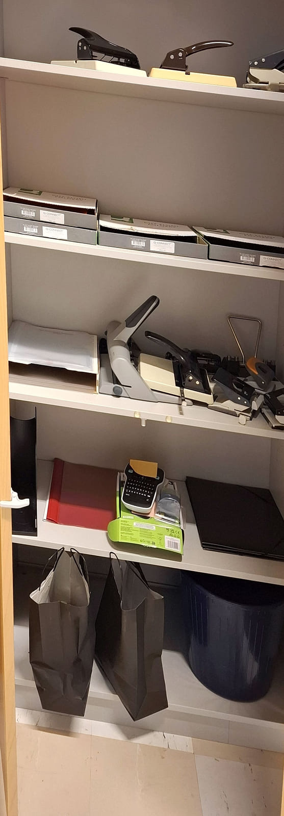 - kopiopaperia 157 riisiä - arkistointi mappeja uusia yli 100kpl - postituspusseja - kirjekuoria kahta kokoa - paperileikkuri - ilmastointilaite - Dymo tarrakirjoitin, muovitaskuja, välilehtiä sekä muita toimistotarvikkeita ja paperitarviketta - paperisilppuri - pieni määrä työkaluja kuten laserit,mitat,taskulamppu,paristoja, jatkojohtoja.