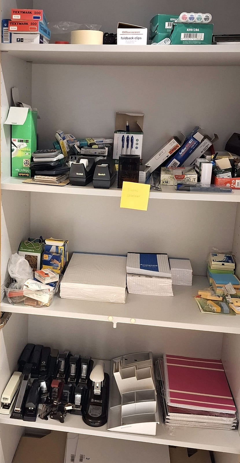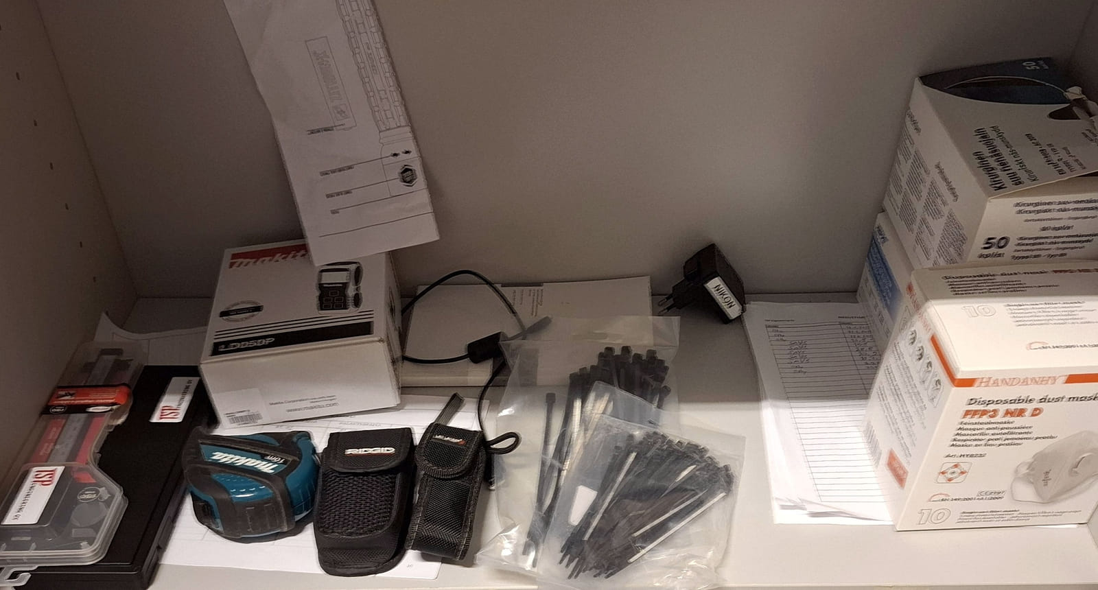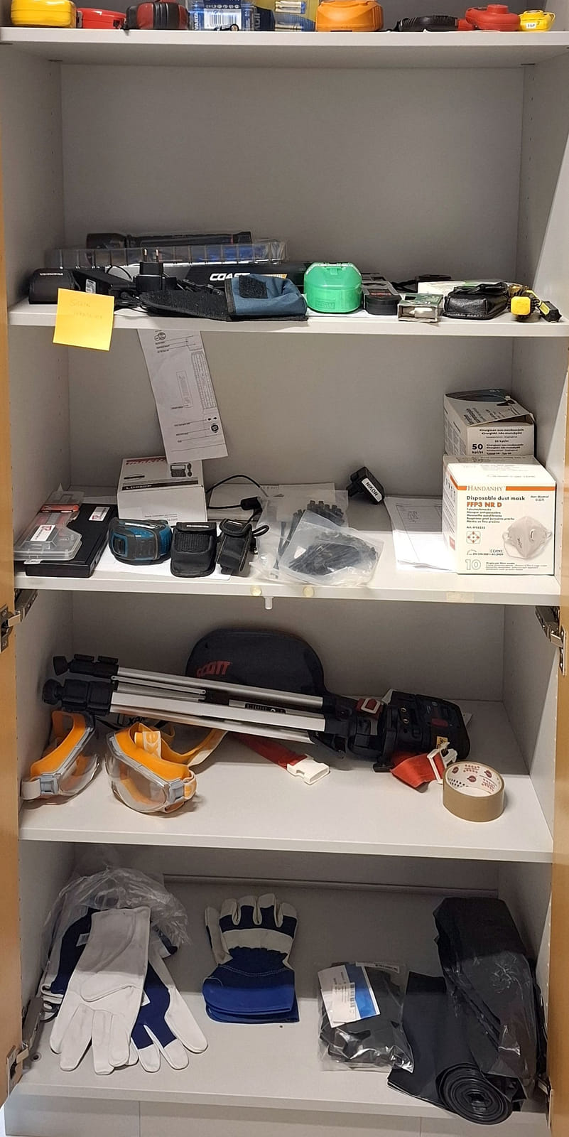 - kopiopaperia 157 riisiä - arkistointi mappeja uusia yli 100kpl - postituspusseja - kirjekuoria kahta kokoa - paperileikkuri - ilmastointilaite - Dymo tarrakirjoitin, muovitaskuja, välilehtiä sekä muita toimistotarvikkeita ja paperitarviketta - paperisilppuri - pieni määrä työkaluja kuten laserit,mitat,taskulamppu,paristoja, jatkojohtoja.