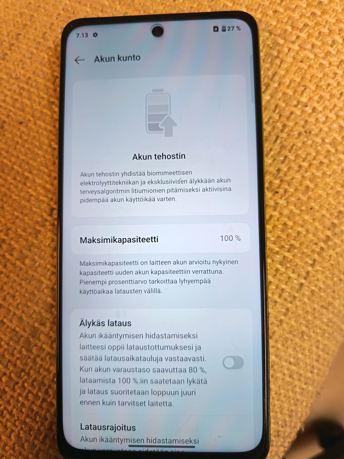 Akun kunto: Maksimikapasiteetti 100 % (järjestelmän ilmoituksen mukaan)