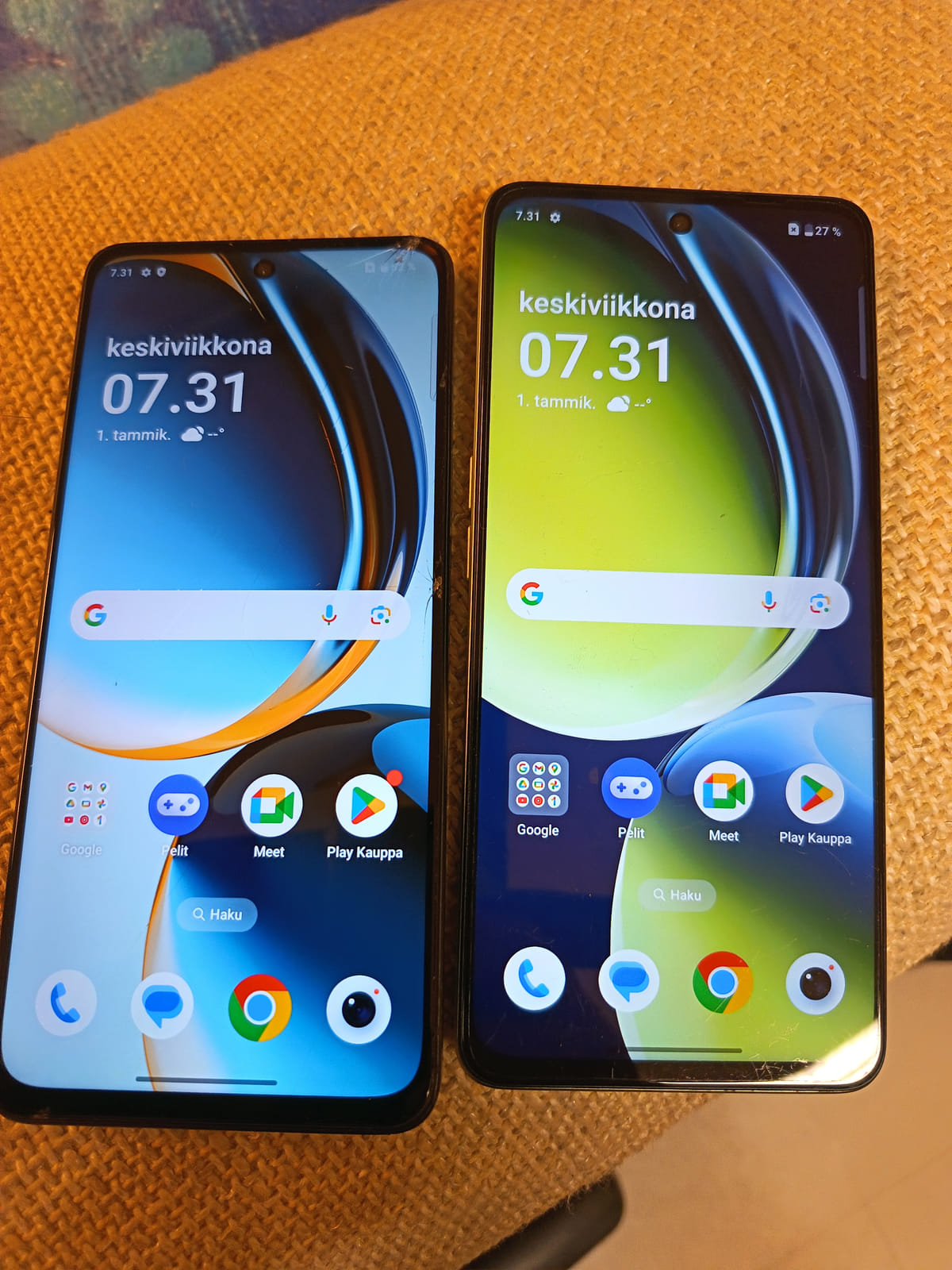 Laitteet käynnistyvät, toimivat ja ovat kuvien mukaisessa kunnossa. Molemmissa puhelimissa on selviä näytön naarmuja ja halkeamia, erityisesti reunoissa ja alakulmissa. Soveltuvat käyttöön, varalaitteiksi tai korjattaviksi.