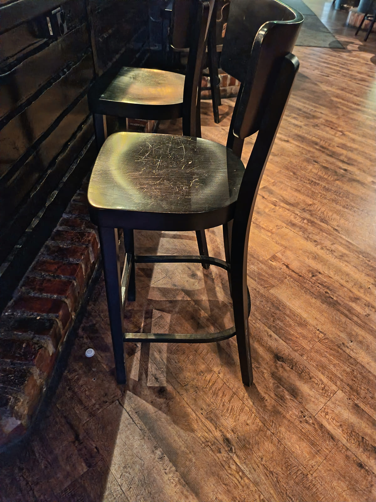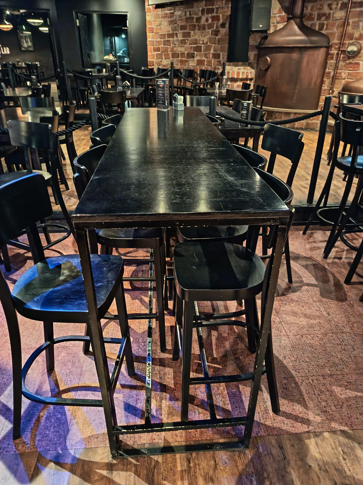 Myydään käytetty, panimoravintolan yhtenäinen ravintolakalustekokonaisuus, joka sisältää sekä matalia että korkeita asiakaspaikkoja.